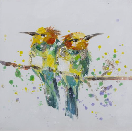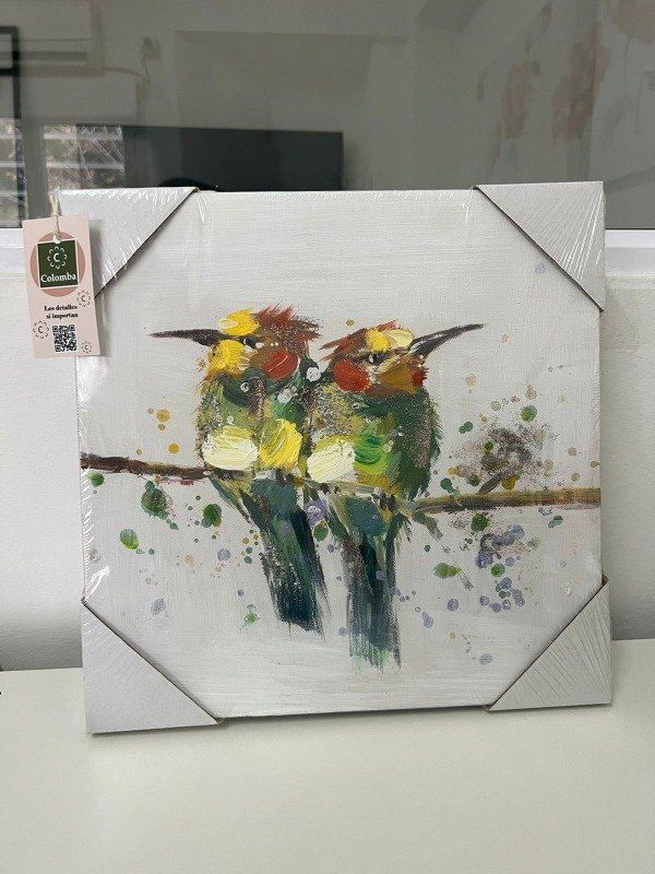 • Delicado cuadro de pájaros multicolores, pintado a mano, ideal para decorar las paredes de tu casa.